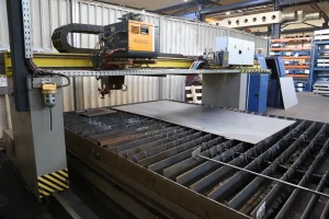 ESAB rezalni stroj tipa Suprarex SXE-P2 5500 v portalni izvedbi z avtogenim gorilnikom in plazemskim gorilnikom. Rezalna površina z odsesovlno mizo je 3000 mm x 10.000 mm plus dodatna površina kot previs za možno obdelavo profilov. Rezalni stroj ESAB se prodaja skupaj s CNC krmiljenjem, vključno z operacijsko programsko opremo s premično nadzorno ploščo, mizo z odsesovanjem, tirnicami in plazemsko rezalno enoto Kjellberg HiFocus 280i. Primerno filtrirno enoto lahko kupite posebej.